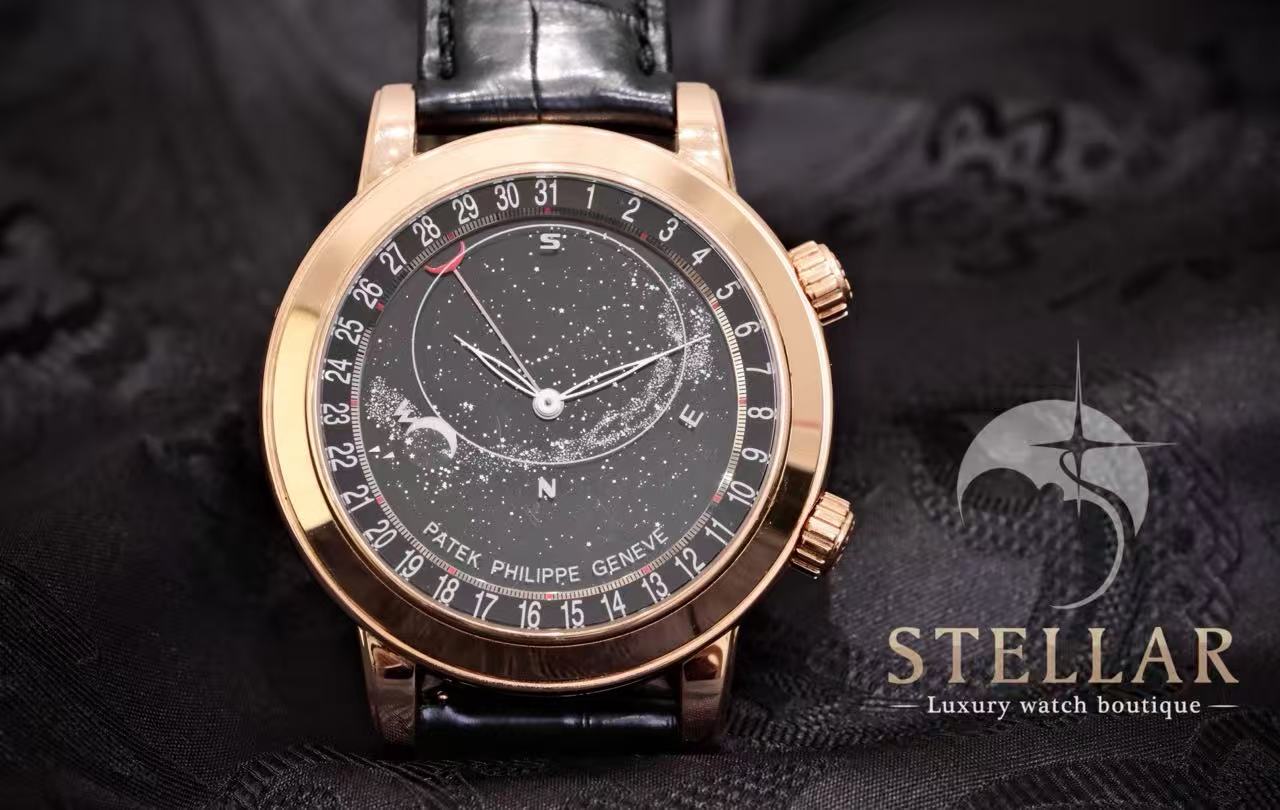 パテック フィリップ 6102R-001は、星空を機械仕掛けの詩へと昇華させた作品。三層のサファイアクリスタルディスクを通して、北半球の星座、銀河、月相、そして月の軌道を精密に再現する。