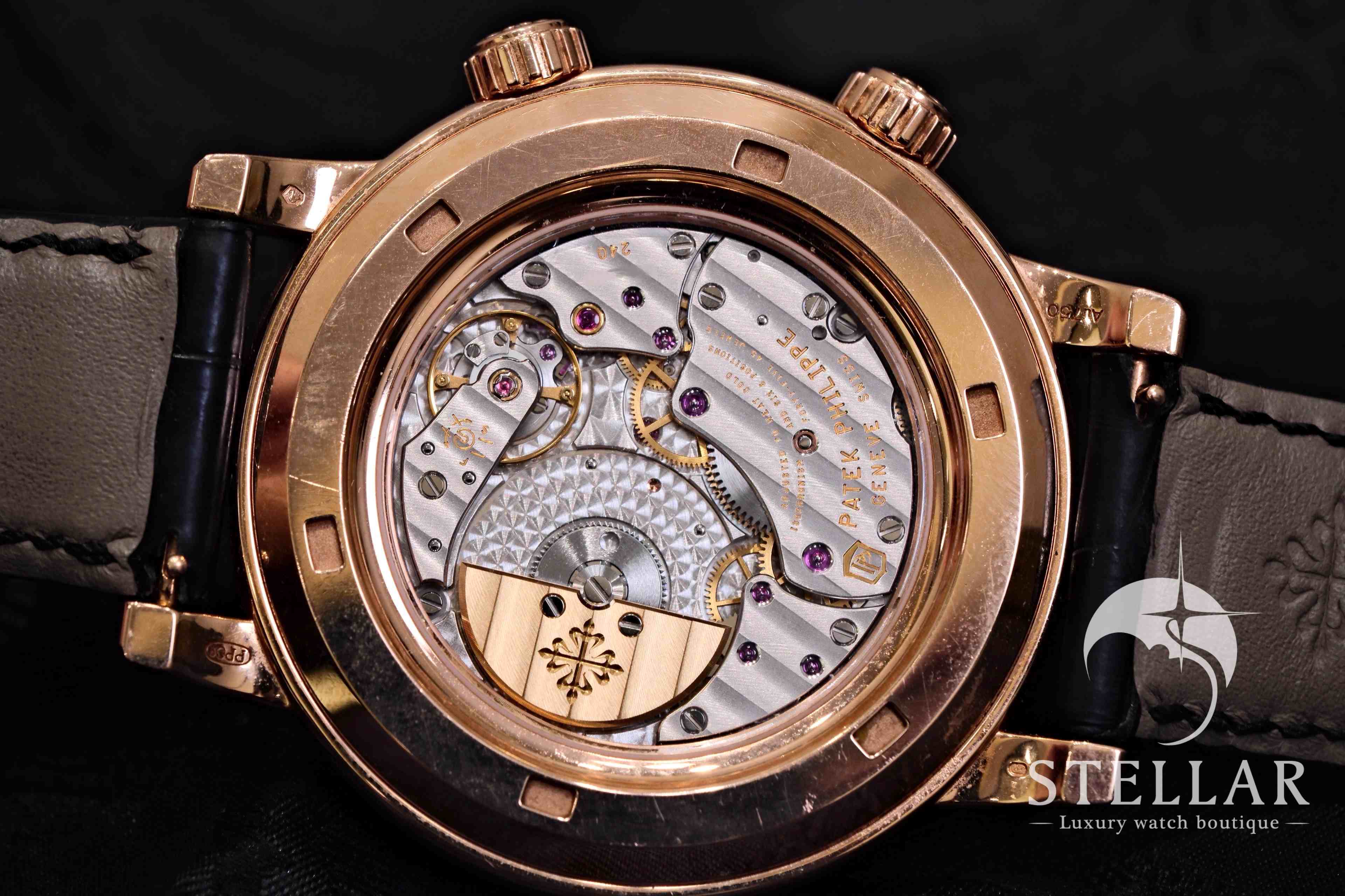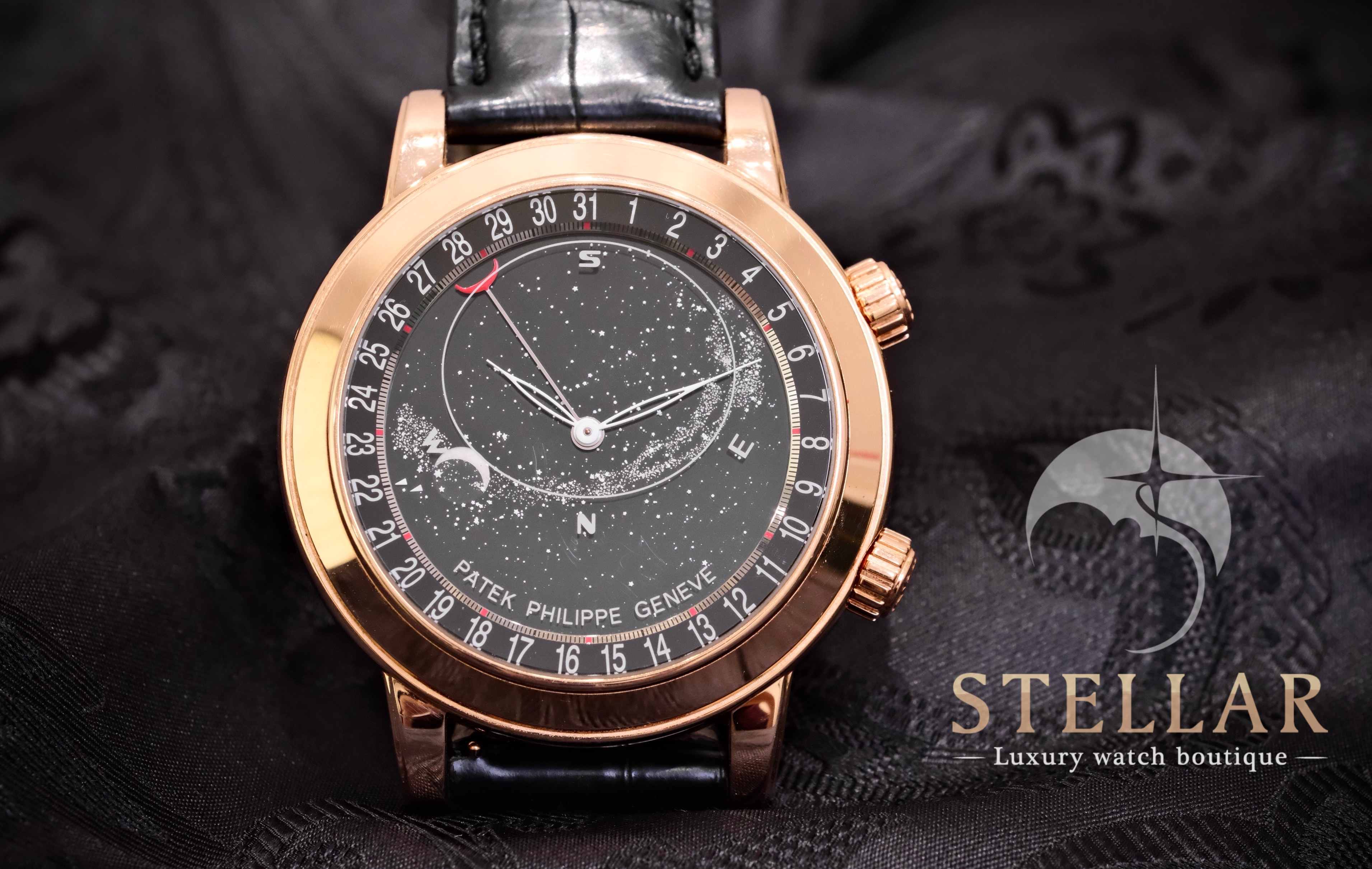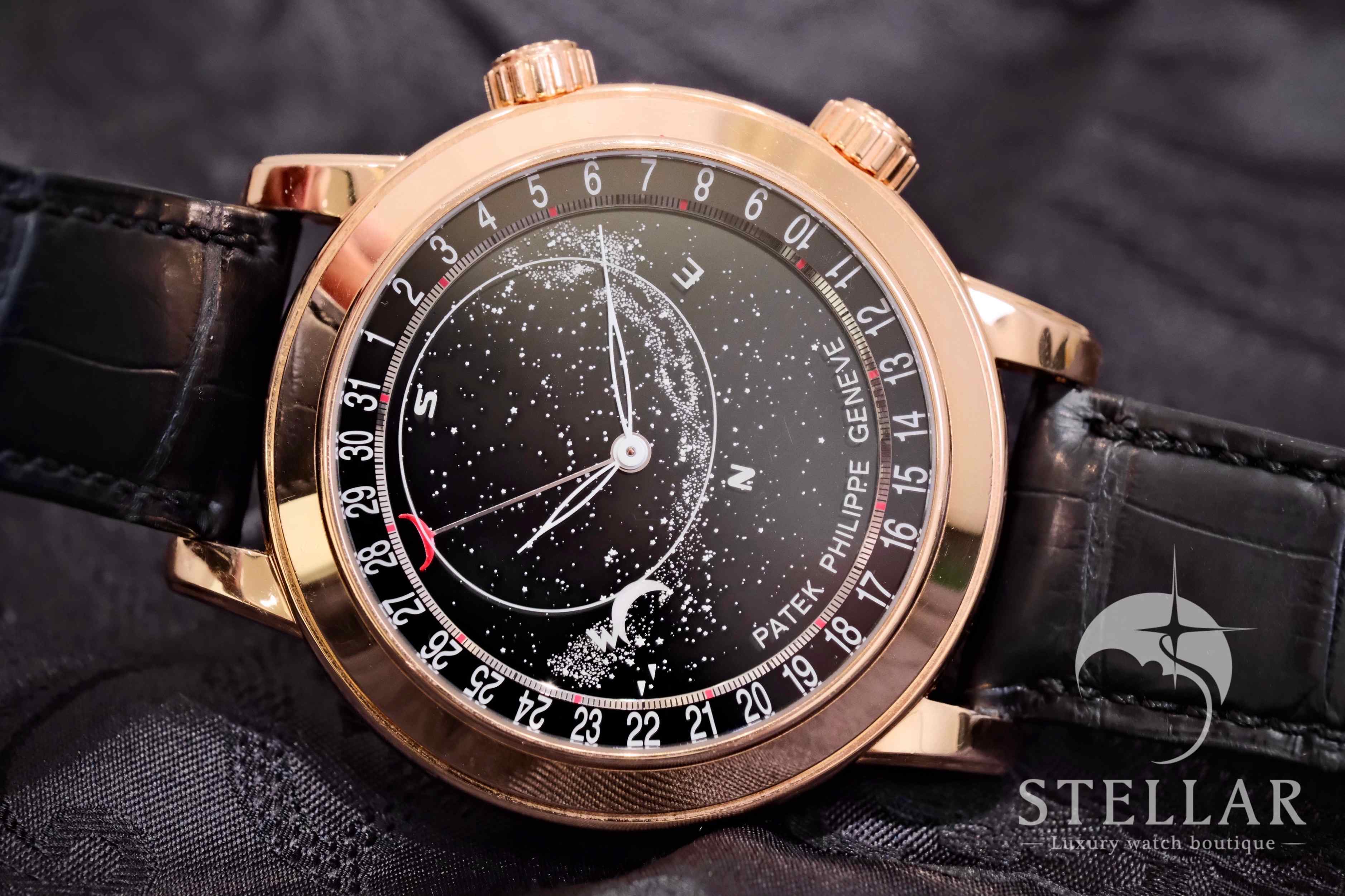 Ref.6102R 搭載於 44毫米玫瑰金錶殼之中,錶盤描繪北半球夜空的夢幻景象。星座與月相隨時間流轉,展現出詩意般的設計特色