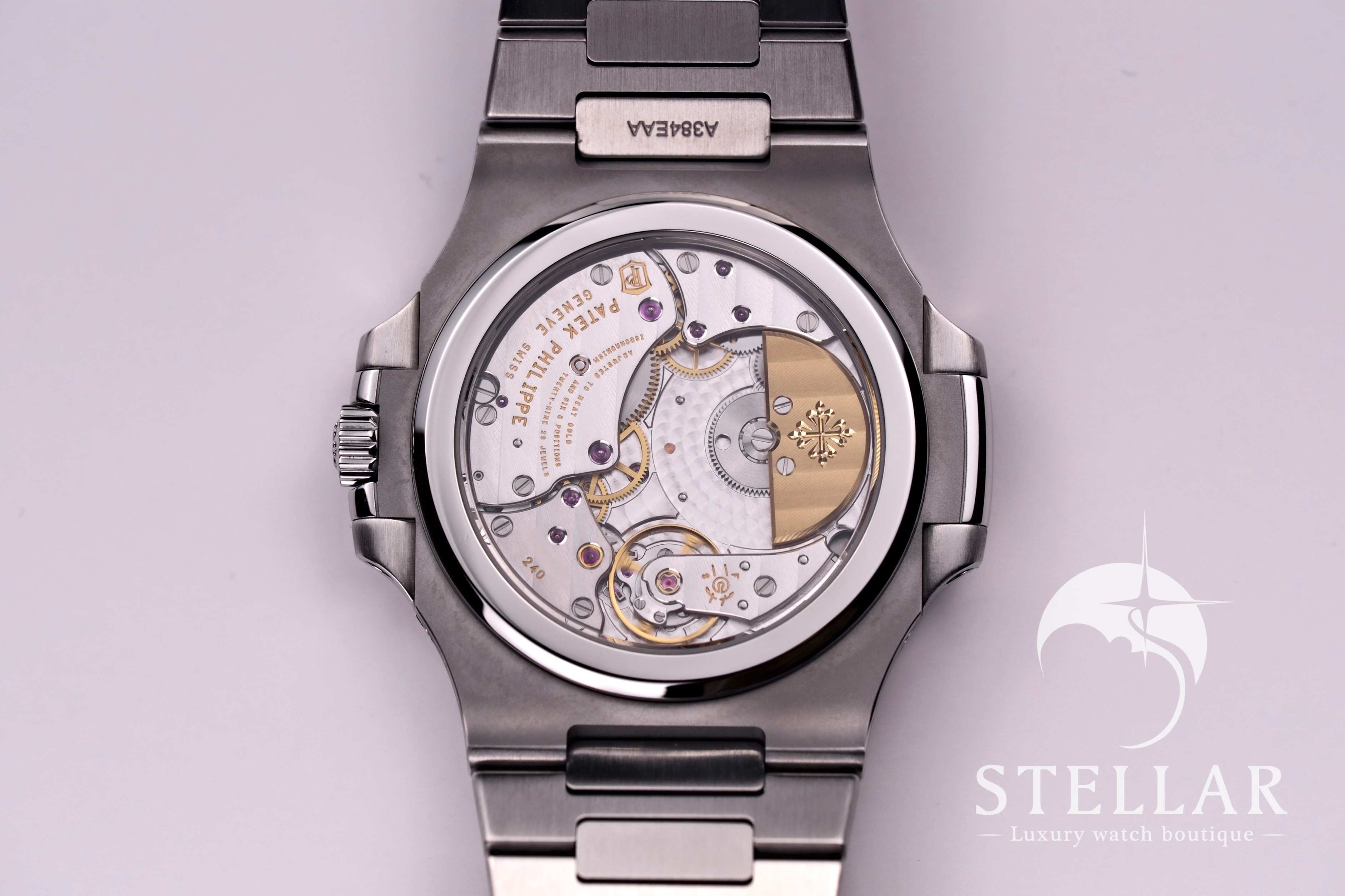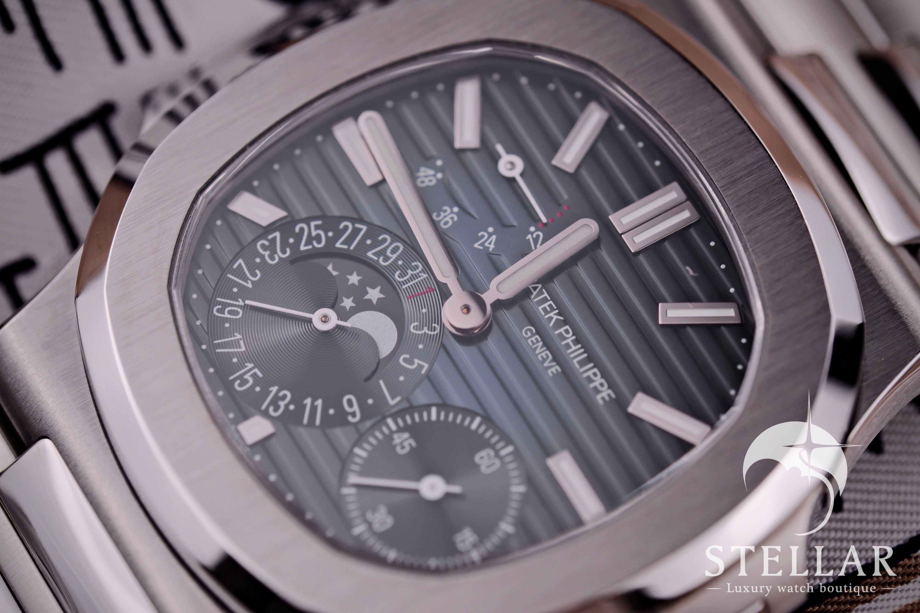 The Patek Philippe Nautilus 5712/1A-001 is a highly popular model featuring a stainless steel case paired with a blue-black gradient dial. Equipped with the self-winding Caliber 240 PS IRM C LU, it offers a moon phase display, power-reserve indicator, and date function—an exquisite timepiece that harmoniously combines elegance and technical sophistication.anship.