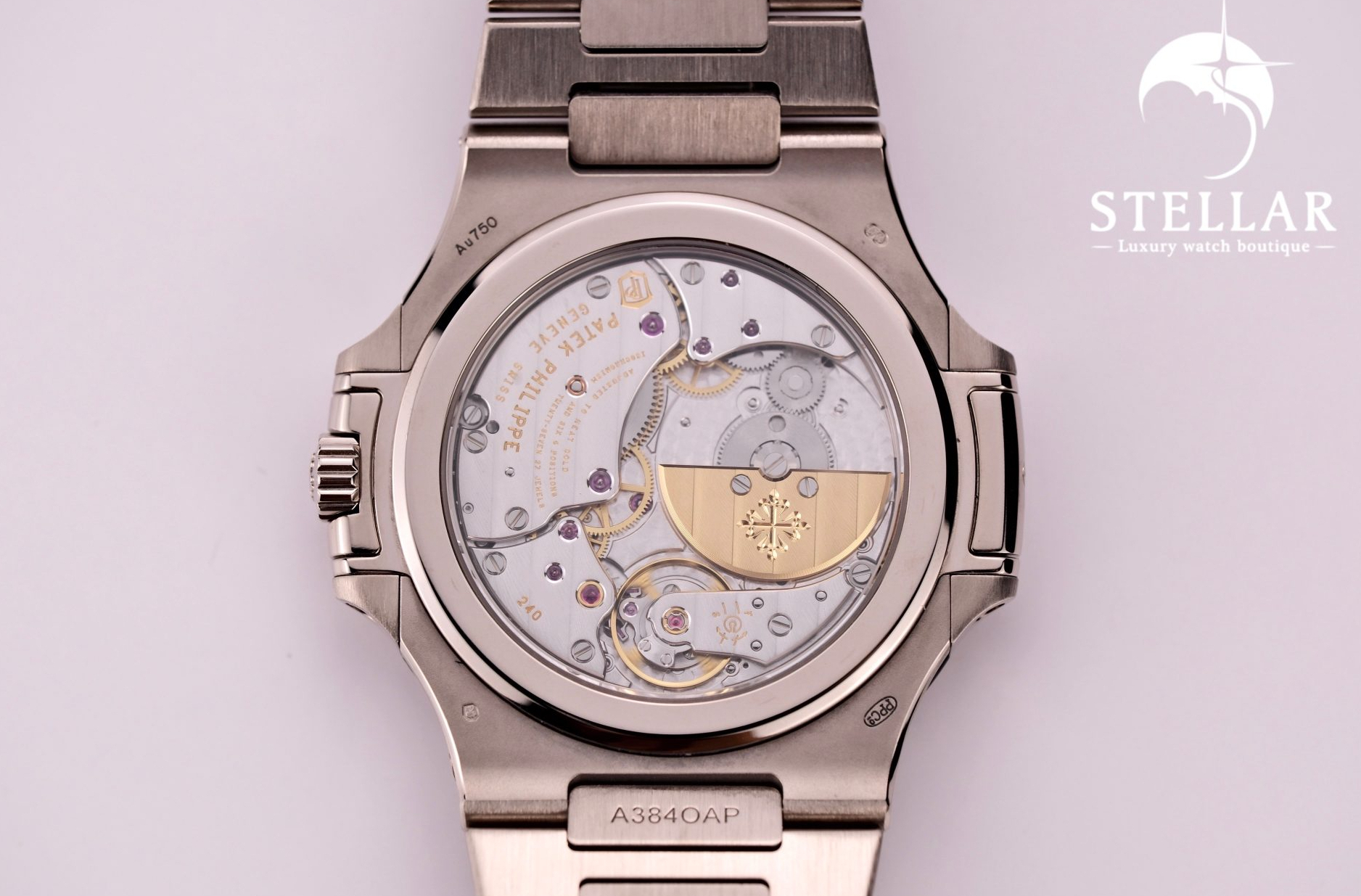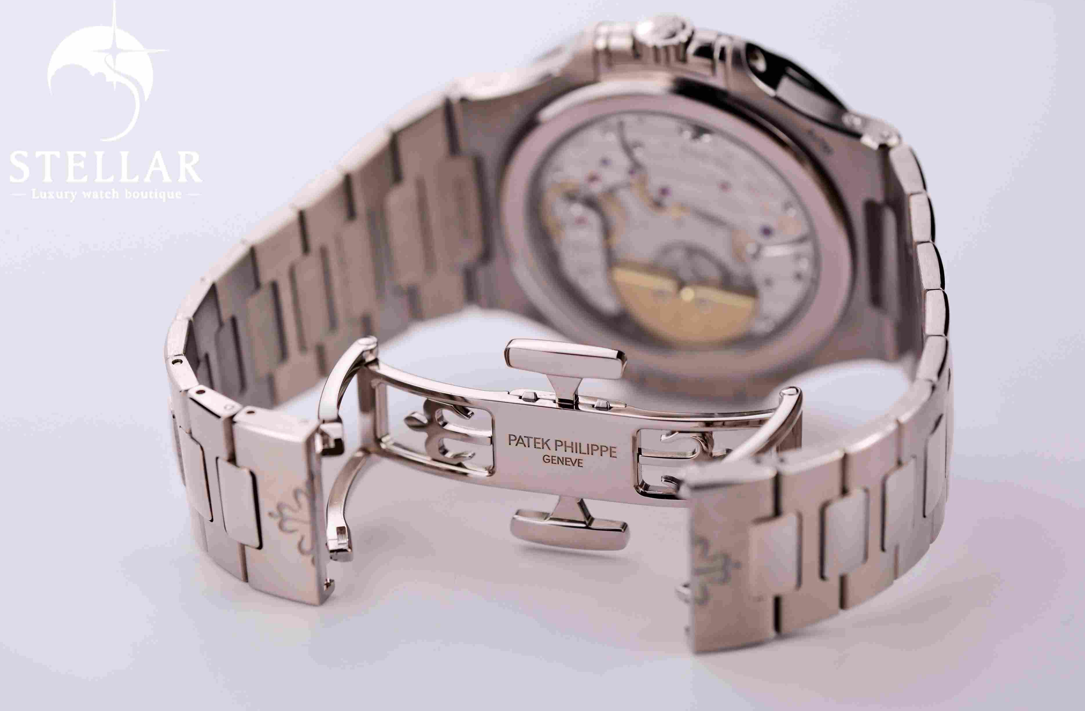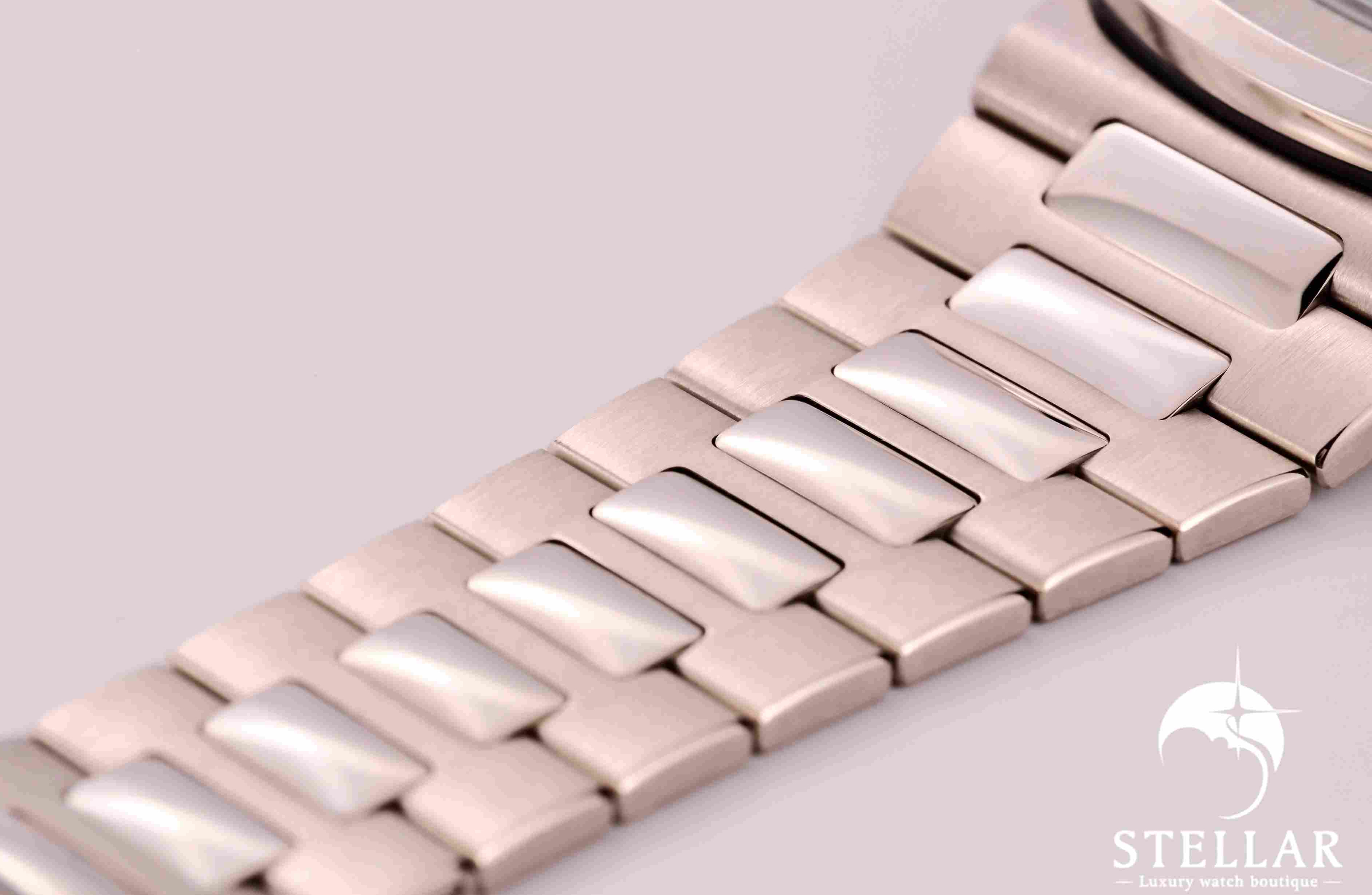 ケースとブレスレットには18Kホワイトゴールドを採用。ケース径は40mmで、ノーチラス特有の舷窓型ベゼルと繊細なサテン/ポリッシュ仕上げが特徴です。
