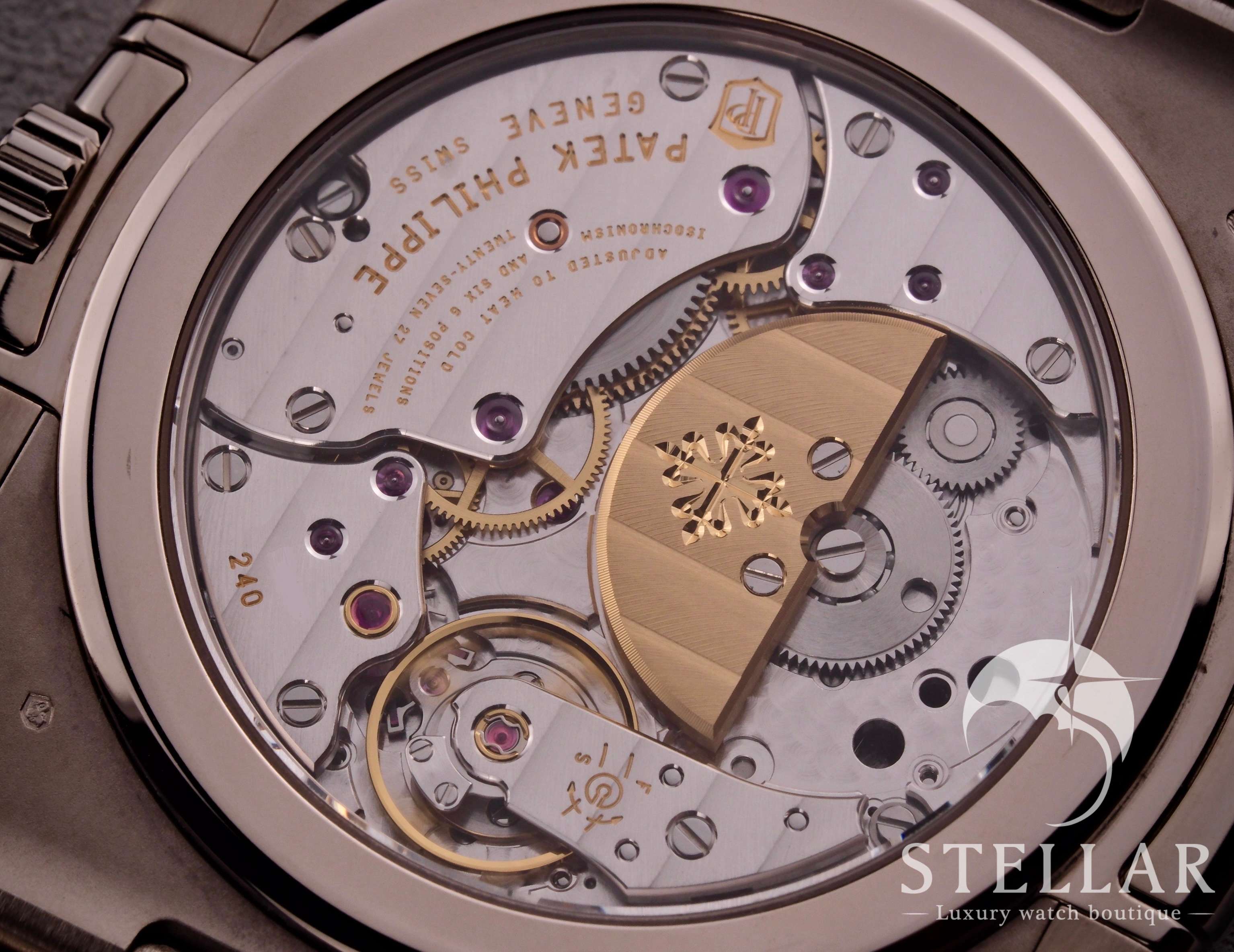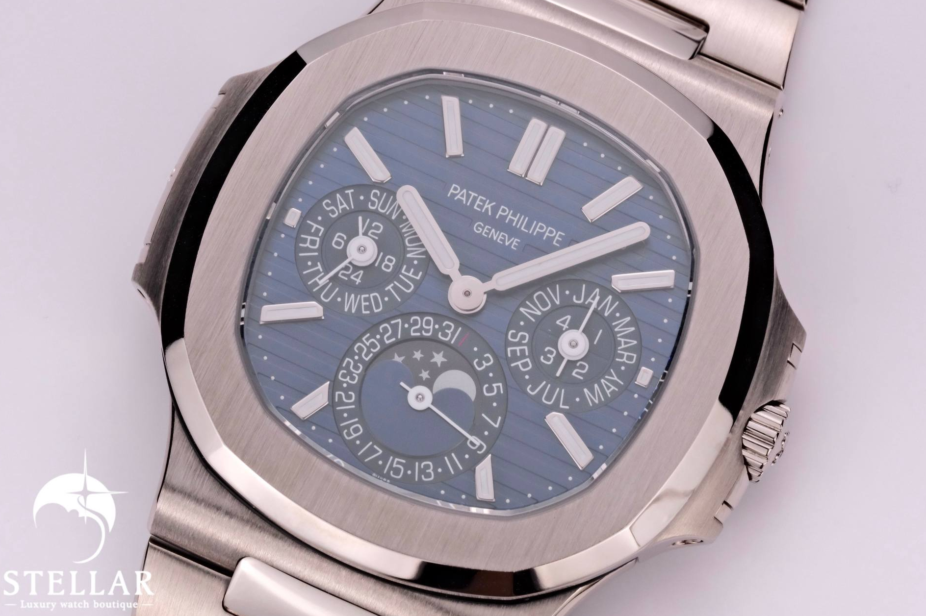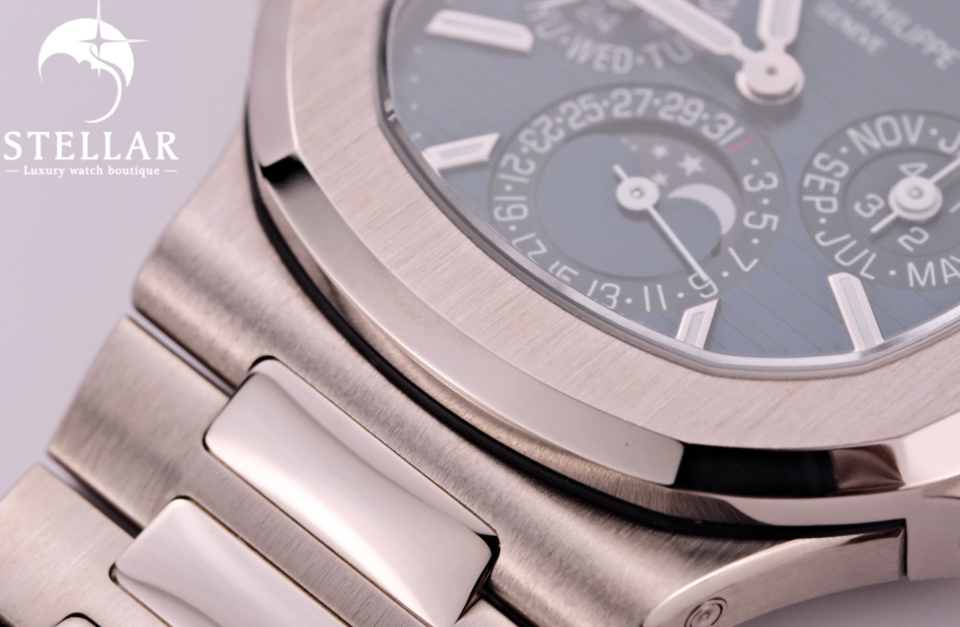 ケースとブレスレットには18Kホワイトゴールドを採用。ケース径は40mmで、ノーチラス特有の舷窓型ベゼルと繊細なサテン/ポリッシュ仕上げが特徴です。