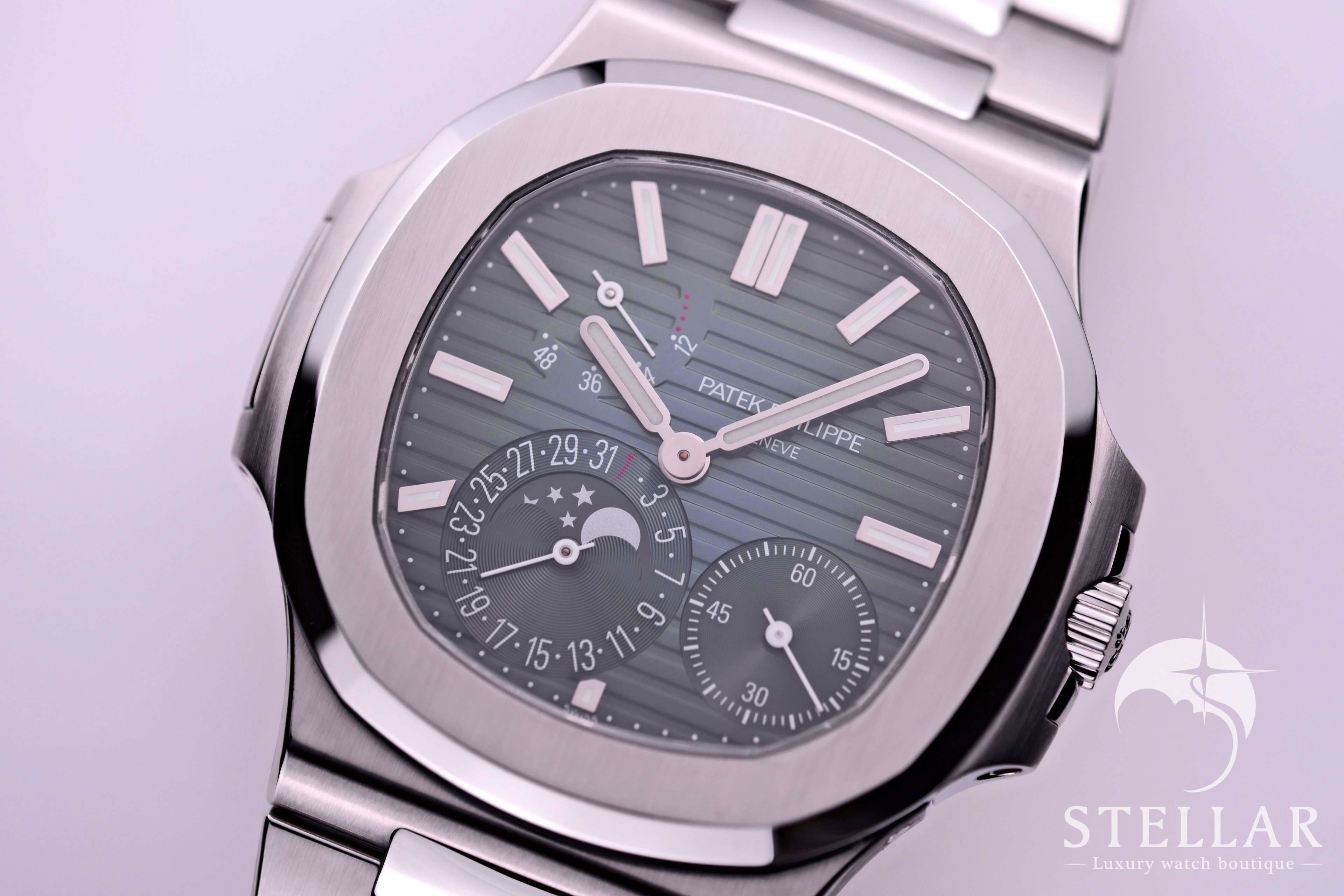 ステンレススチール製ケースに、ノーチラス特有の水平エンボスが施されたブルー・ブラック・グラデーションダイヤルを組み合わせた人気モデル。 ムーンフェイズ、パワーリザーブ表示、ポインターデイトを備えた自動巻キャリバー240 PS IRM C LUを搭載し、機能性と美しさを高次元で融合しています。