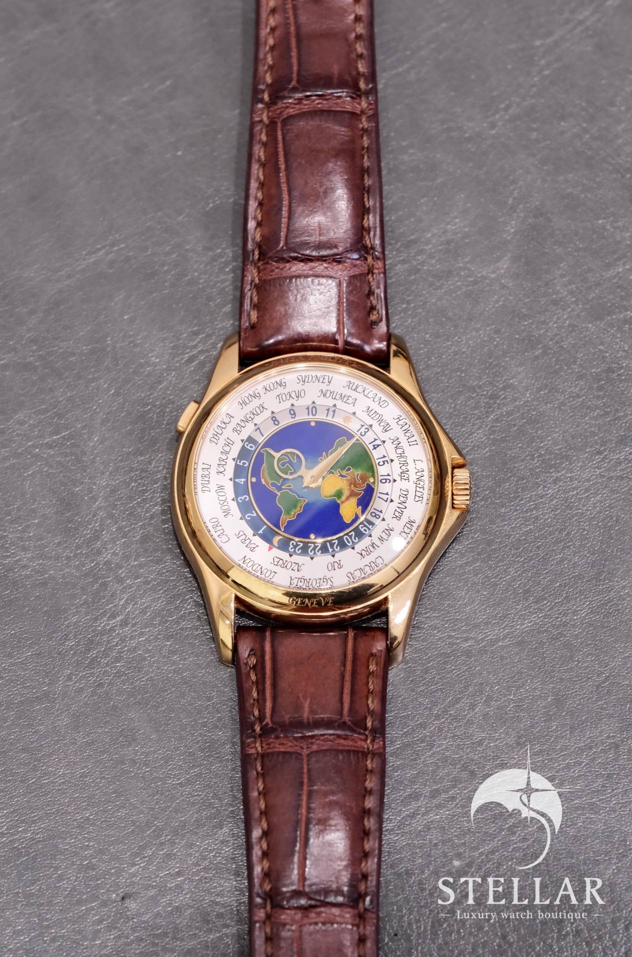 パテック・フィリップの名作「ワールドタイム」コレクションの中でも、5131J-014 は特に高い人気を誇るモデルです。18Kイエローゴールドのケースに、熟練した職人によるクロワゾネ(有線七宝)エナメルで描かれた世界地図を組み合わせ、芸術作品のような存在感を放ちます。