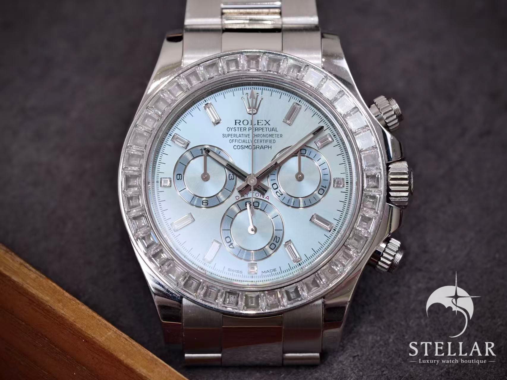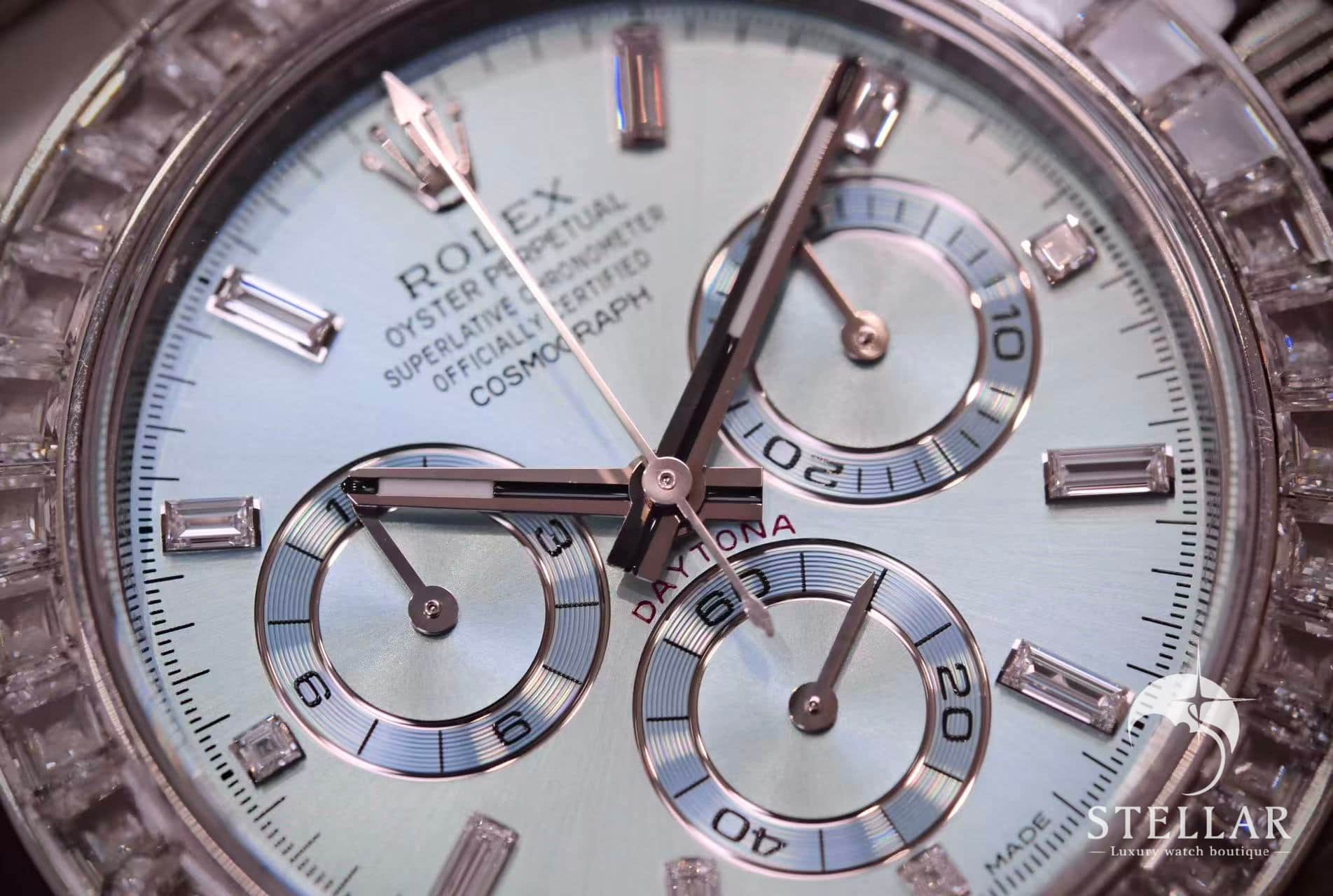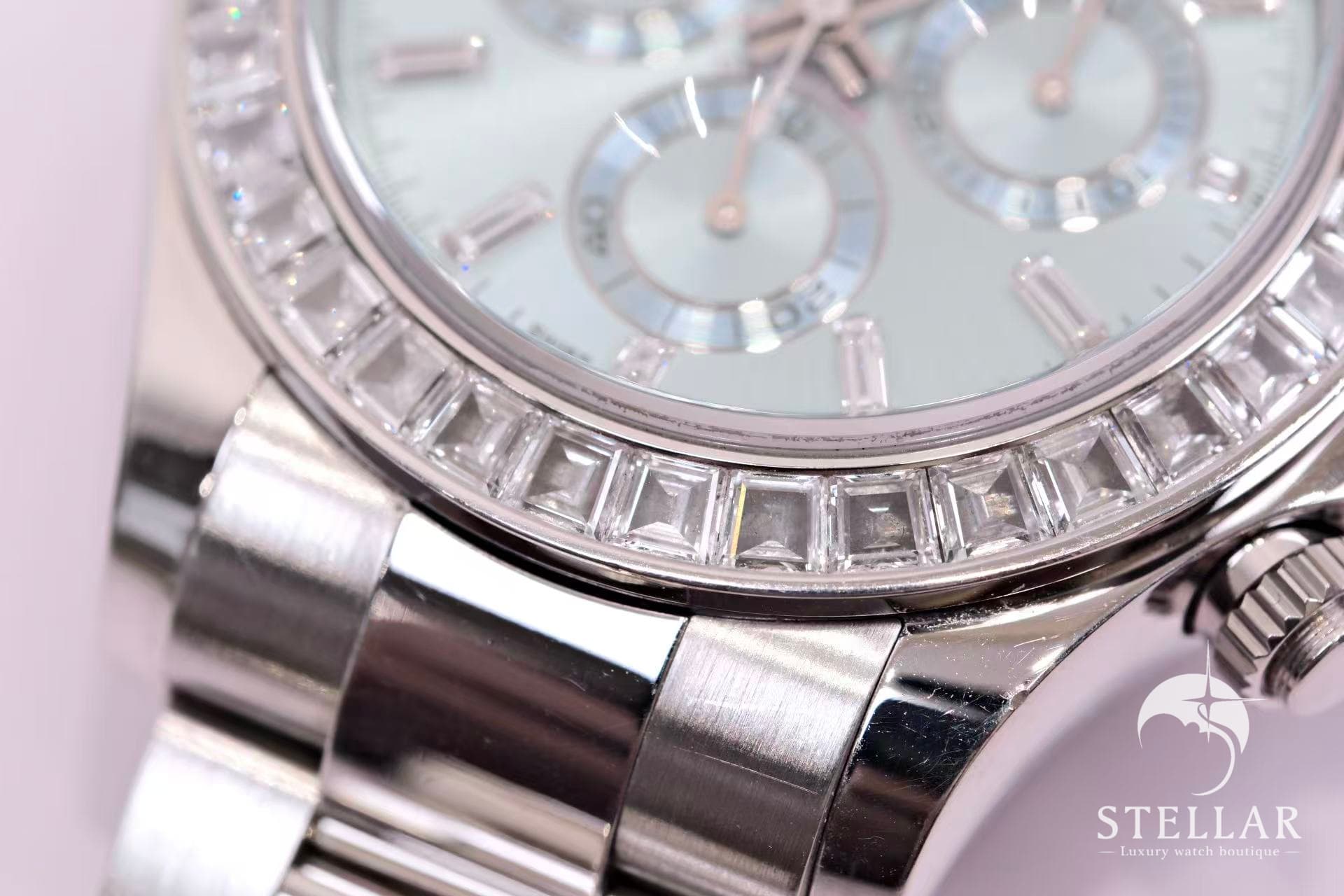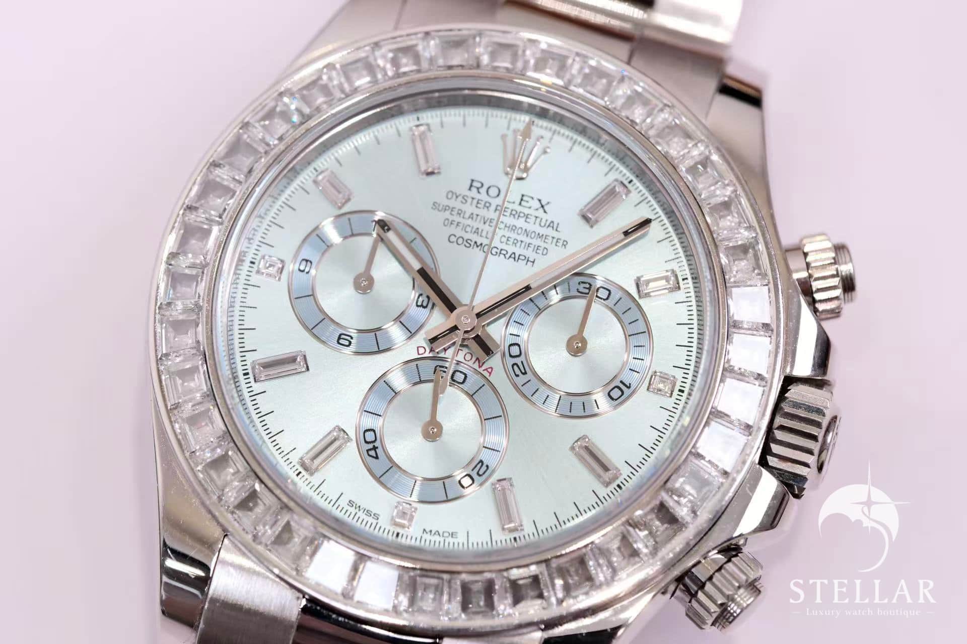 プラチナケースとバゲットカットダイヤモンドベゼルを備えた、デイトナ最上位クラスの特別モデル。