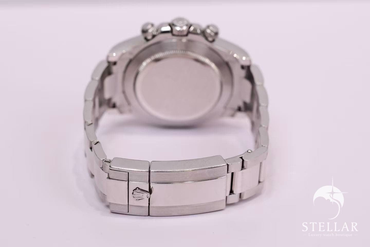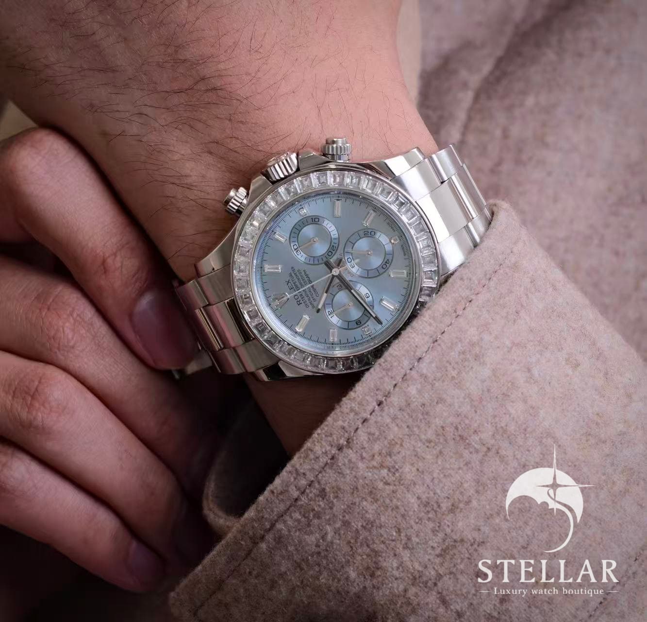 ケース素材には希少なプラチナを採用し、圧倒的な重厚感と気品ある輝きを実現。ベゼルにはバゲットカットダイヤモンドが贅沢にセッティングされ、スポーティなデイトナに極めてラグジュアリーな表情を与えています。