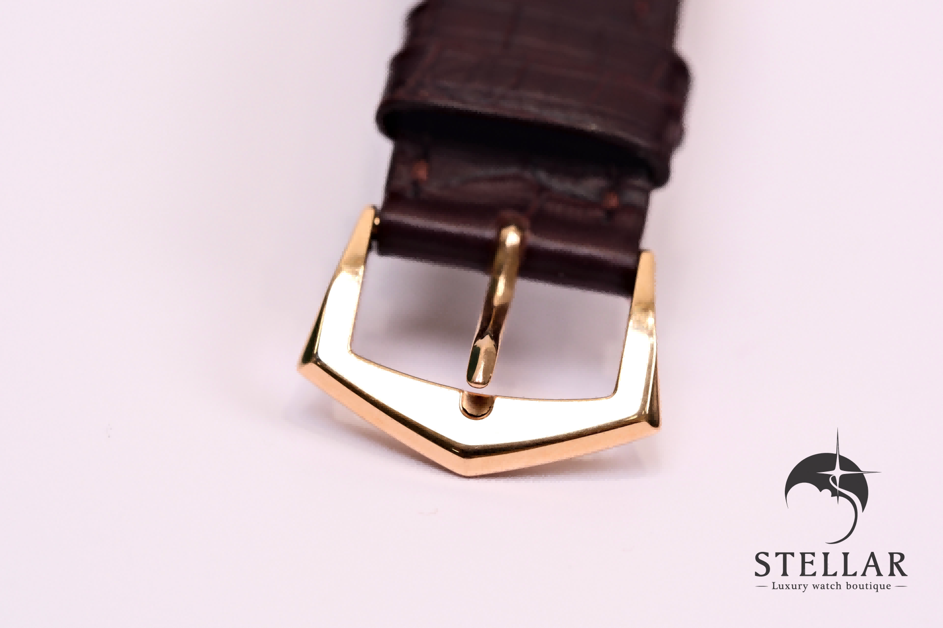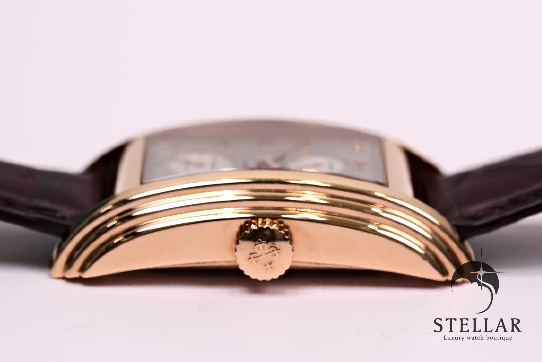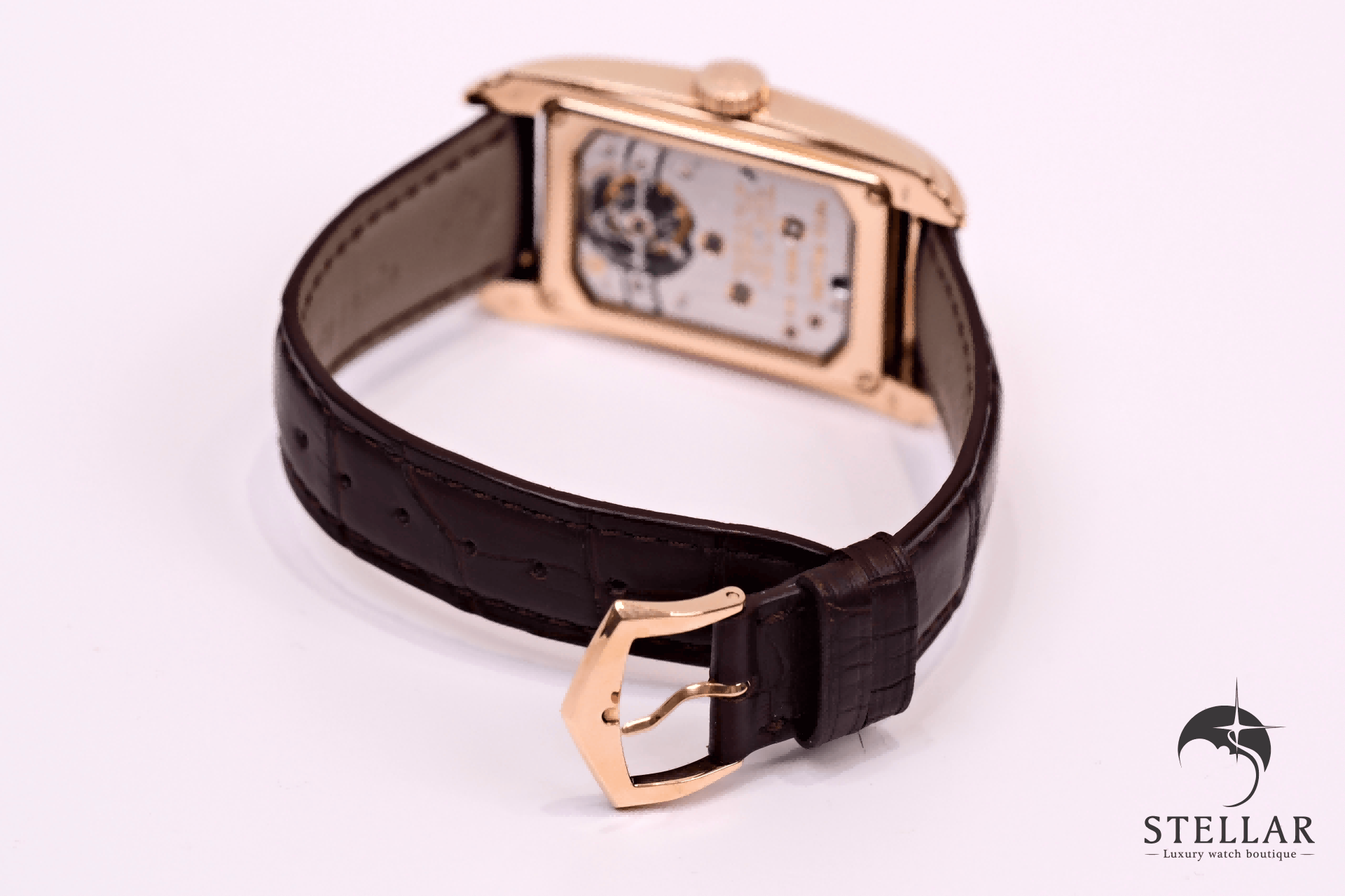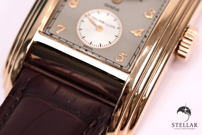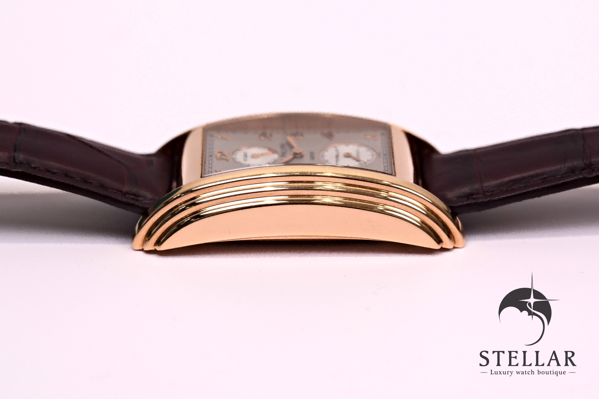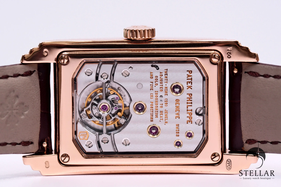 アール・デコ様式を基調とした縦長レイアウトと、トノー型ローズゴールドケースが調和した、気品あるクラシカルデザイン。