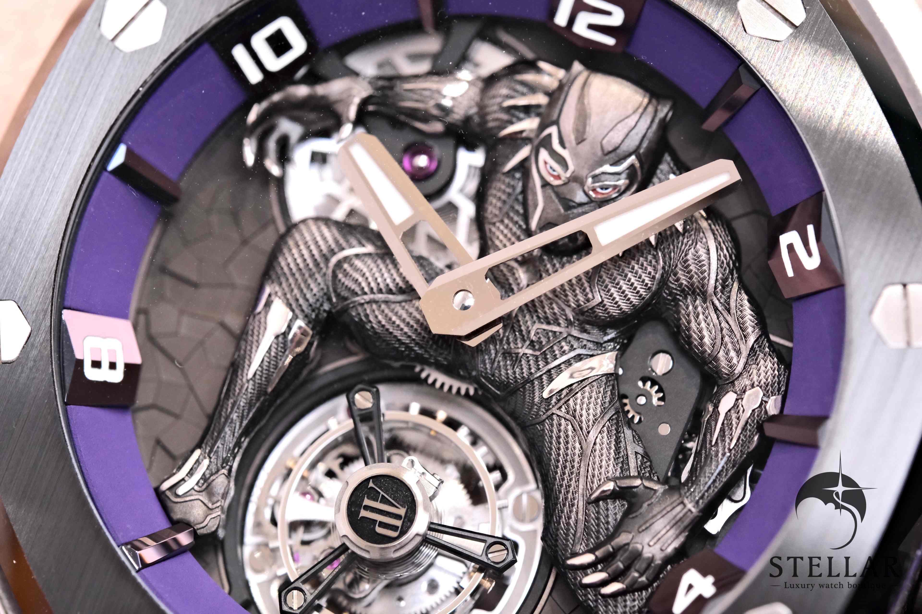 手彫りブラックパンサー彫刻を文字盤に配した、芸術性と機械美を融合した限定コンセプトモデル。